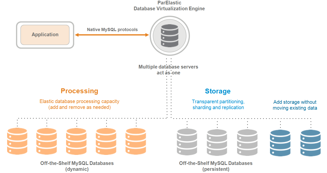 ParElastic 데이터베이스 가상화 엔진은 현재 관계형 데이터베이스의 유연성 및 성능, 신뢰성을 향상 시키면서 저장 및 처리 비용을 감소시킵니다. 단일 데이터베이스 서버의 성능을 초과하는 워크로드에 대해 필요에 따라 데이터베이스를 확장 및 운영을 지원하는 것이 가능하게 해줍니다.